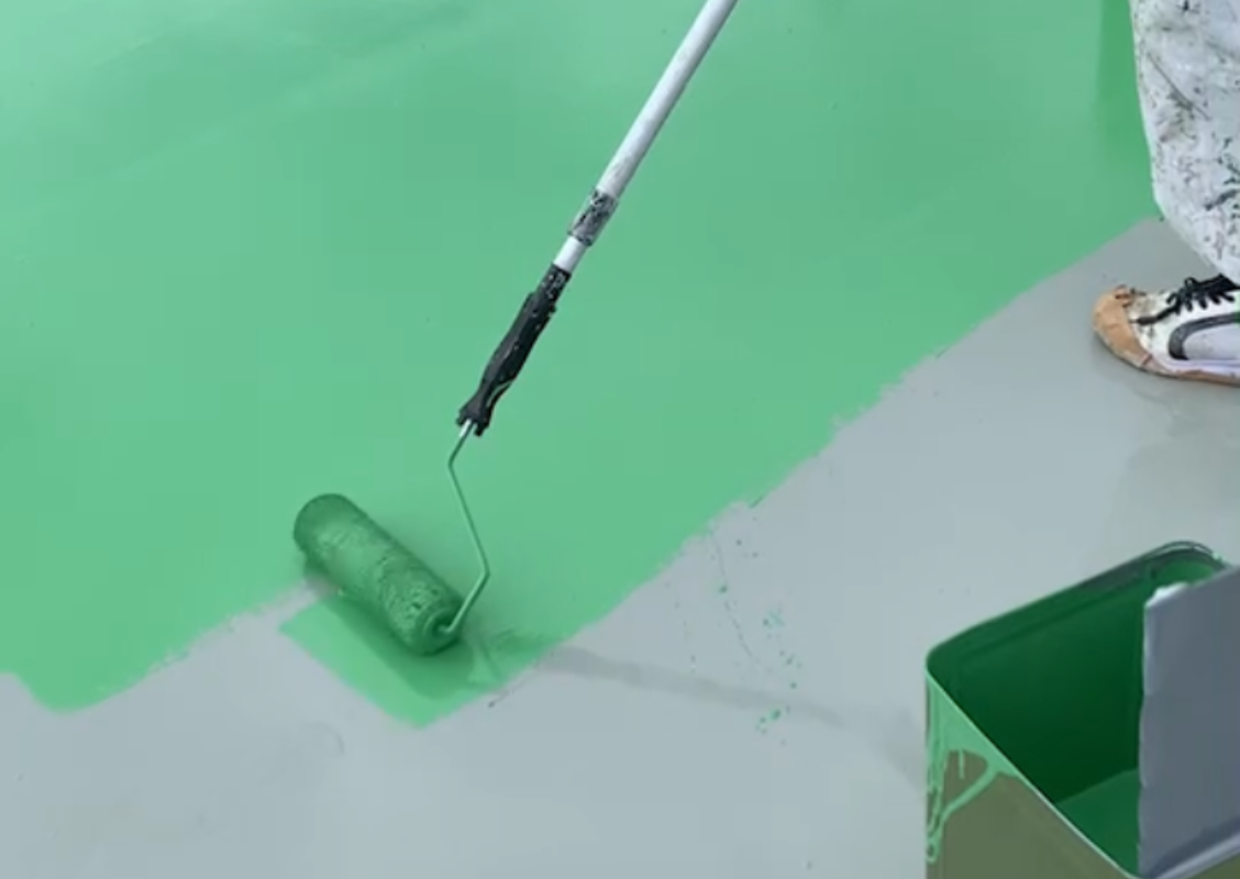 ウレタン防水剤をコテ塗りしている状況です。なぜコテでしょうか?決まった面積に対して決まった質量、厚みをつけるためにコテ塗りの方が均等に塗ることができるので、慎重にコテで塗ります。