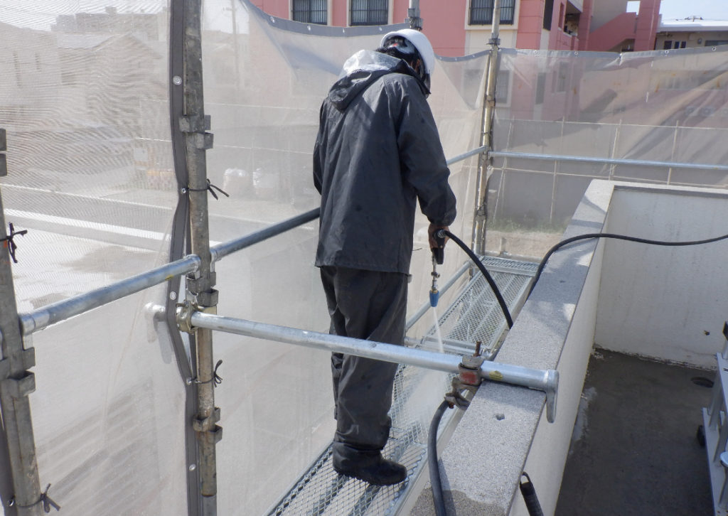 足場架設の次には、高圧洗浄を行います。高圧洗浄では、塗装をする前に、外壁についている汚れや不純物、特にコケやカビ、チョーキング現象によって浮き出た粉などをしっかり取り除き、塗装に適する塗布面に仕上げることが目的です。