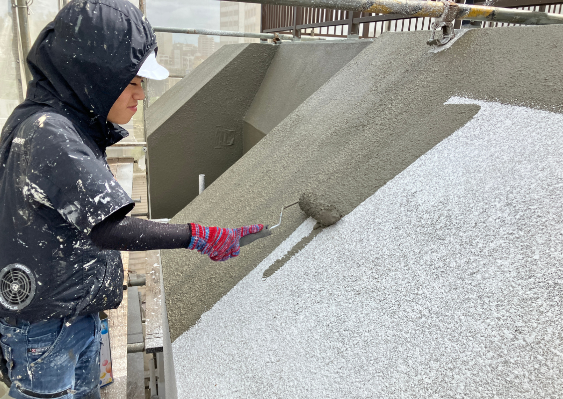 まずは下塗り。これは壁面と塗料をしっかりと付ける役割がある大切な工程です。壁面によって、それぞれに合った「下地強化材」を使用するのがポイントです。